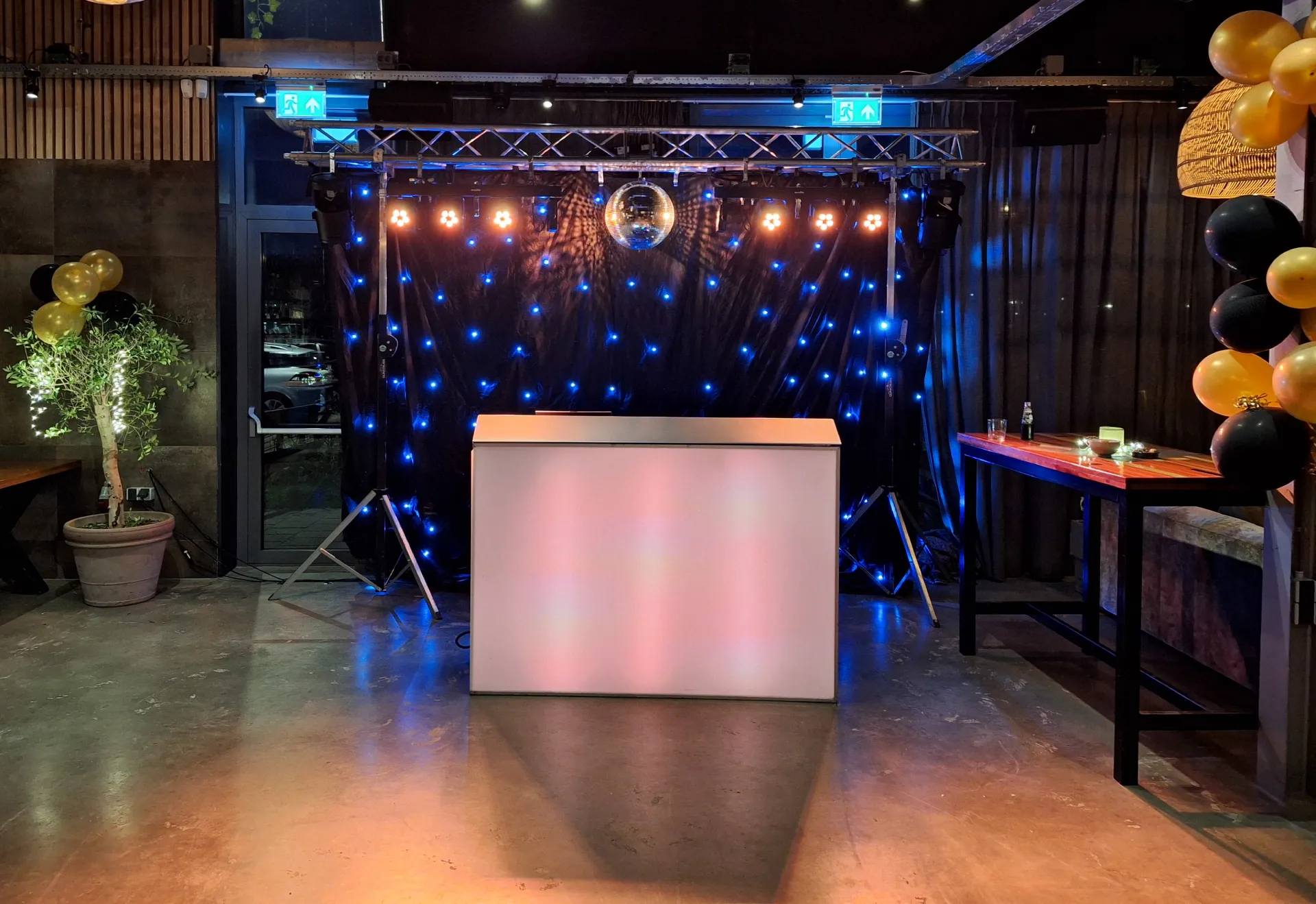 • 4 LED discospots en verlichte dj booth voor een feestelijke sfeer