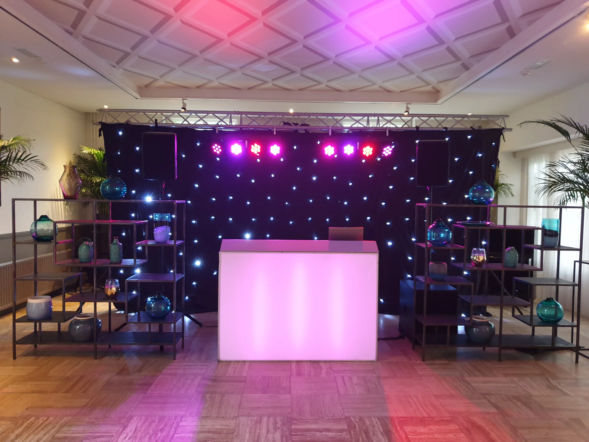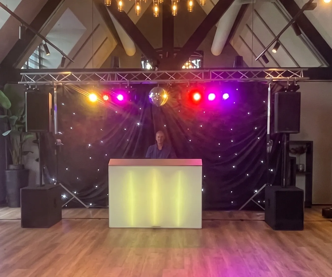 • 8 LED spots, 2 moving heads, LED pilaren, sterrendoek, spiegelbol, rook en bellen